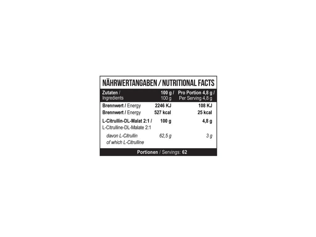 Citrulline Malate je kombinace aminokyseliny L-citrulin a kyseliny jablečné (malátu). Podporuje produkci oxidu dusnatého (NO), což vede k lepšímu prokrvení svalů, vyššímu výkonu a lepší vytrvalosti.