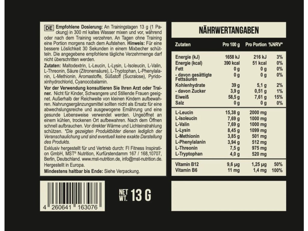 Každý 13g sáček MST® EAA & BCAA obsahuje 7,61 g esenciálních aminokyselin: L-leucin, L-lysin, L-isoleucin, L-valin, L-threonin, L-tryptofan, L-fenylalanin a L-methionin.