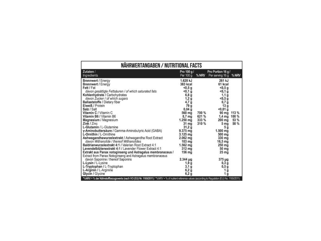 Hlavní roli hraje GABA (1 500 mg) – přirozený neurotransmiter, který tlumí nadměrnou aktivitu mozku a pomáhá rychleji usnout. Její účinky doplňuje ashwagandha KSM-66® (300 mg), klinicky ověřený adaptogen, který snižuje hladinu stresového hormonu kortizolu a podporuje duševní rovnováhu bez rizika návyku.