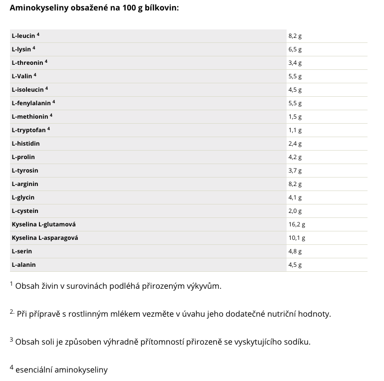 Bílkoviny přispívají k nárůstu a udržení svalové hmoty a podporují normální stav kostí. Díky vyváženému aminokyselinovému profilu – včetně leucinu, lysinu, valinu nebo isoleucinu – podpoříš regeneraci po tréninku i každodenní aktivní život.