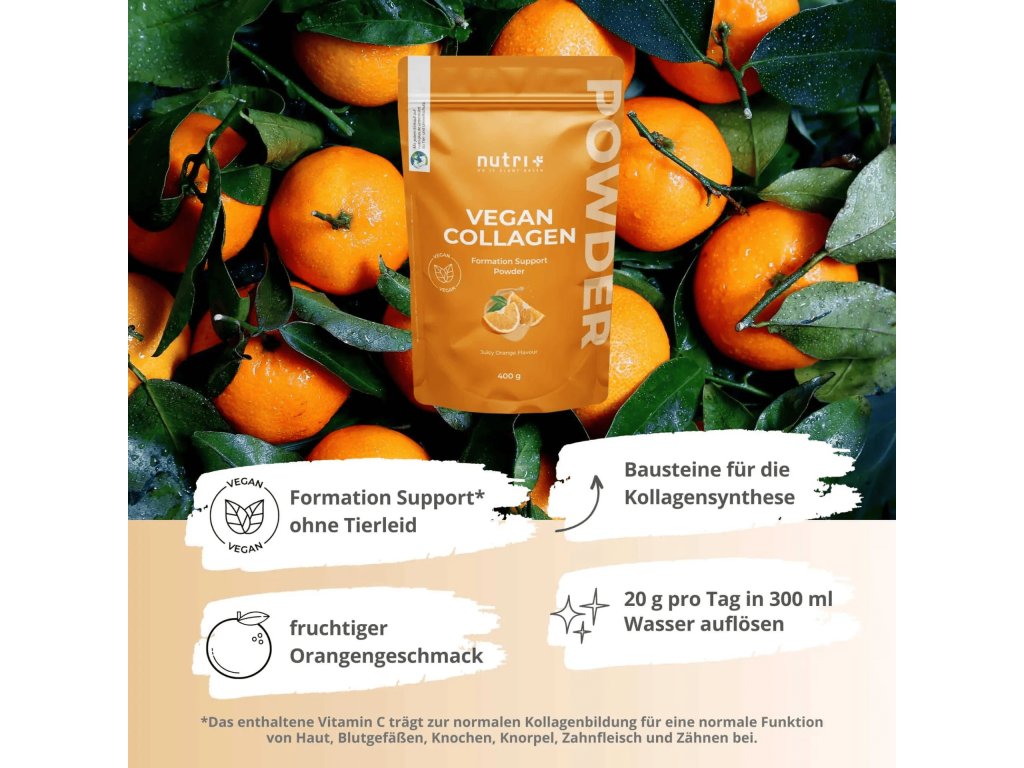 Zažij moderní veganskou podporu tvorby kolagenu bez kompromisů. Vegan Collagen Formation Support s příchutí šťavnatého pomeranče dodá tvému tělu aminokyseliny, vitamín C, kyselinu hyaluronovou i koenzym Q10. Podpoř svou pleť, vlasy i klouby čistě rostlinnou cestou – chutně, efektivně a s respektem k tvému životnímu stylu.