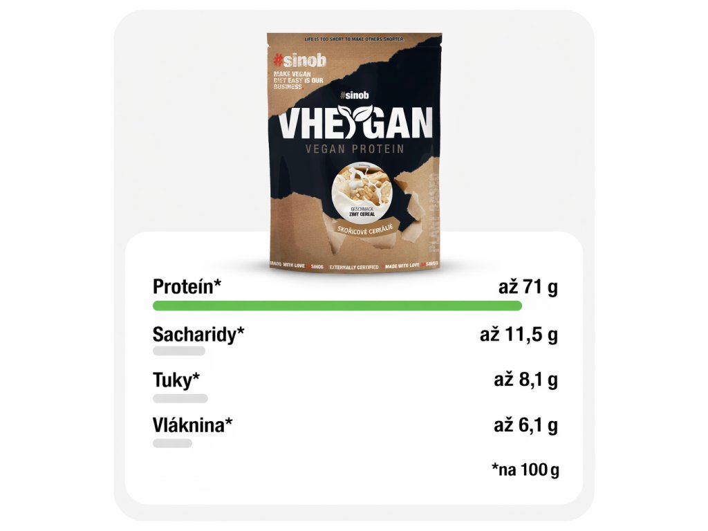 Vheygan Veggy+ je odpovědí na otázku, jak má vypadat moderní veganský protein. Nabízí vysoký obsah bílkovin (cca 71 % na 100 g), výbornou chuť a promyšlené složení bez sóji, laktózy a ořechů.